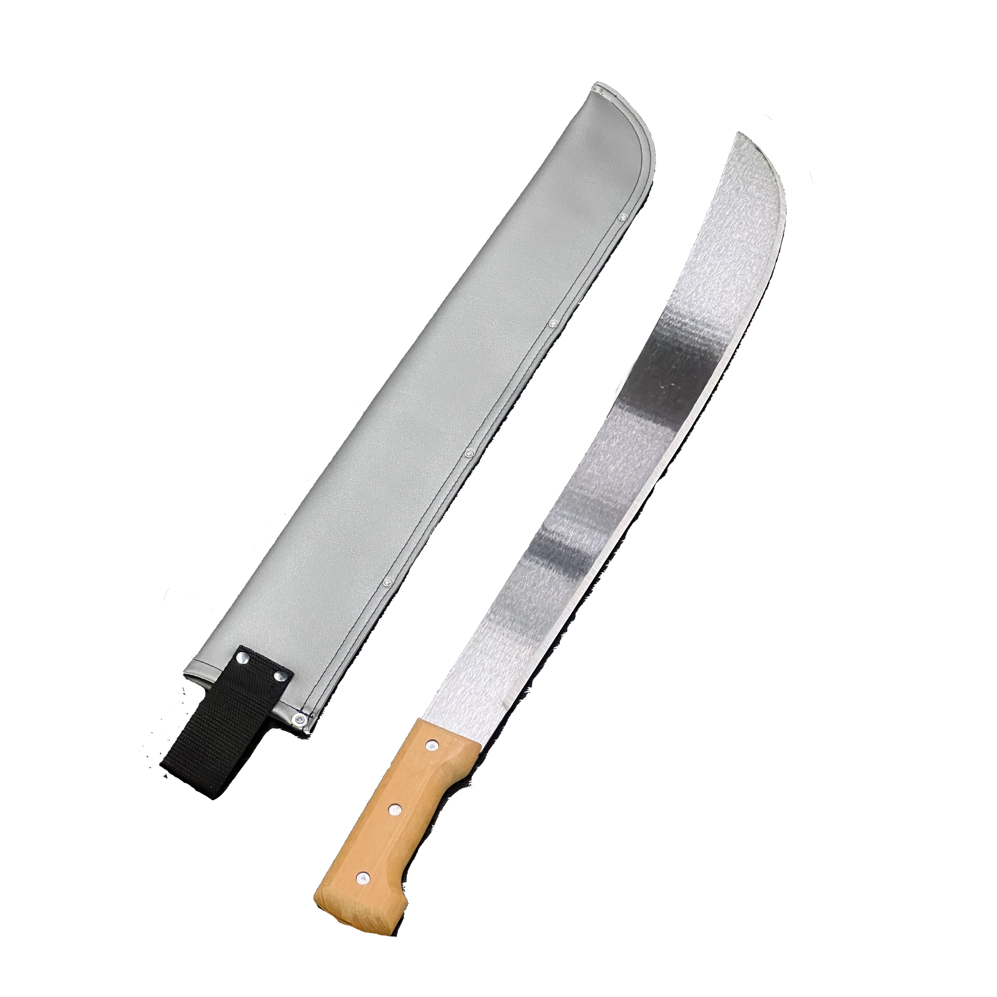 Heavy-duty 22" machete crafted from SAE 1070 steel, hardened to 48–52 RC for durability and reliable cutting performance. Features sturdy wood handles secured with nickel-plated rivets for a comfortable grip. Supplied with a protective vinyl sheath.