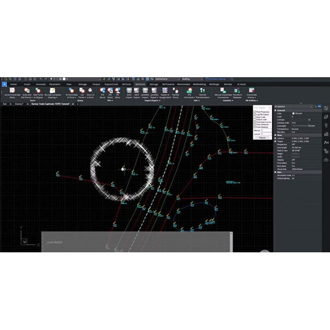 - Survey Specific Tools: Tools for linework and block generation from point descriptions, including import options for linework created in the field, COGO, surveying focused dynamic labeling, and geodetic tools.