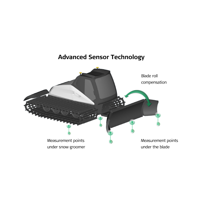 Three-point measurement under the blade reduces the risk of collision with the terrain and ensures precision when working with a tilted blade. Three measurement locations ensure more precise positioning of the blade according to the design model. The dual slope technology ensures blade roll compensation which significantly enhances the accuracy of the snow depth measurements when rolling the blade up or down. Blade roll compensation is an advantage when grooming slopes and when creating snow parks and competition courses.