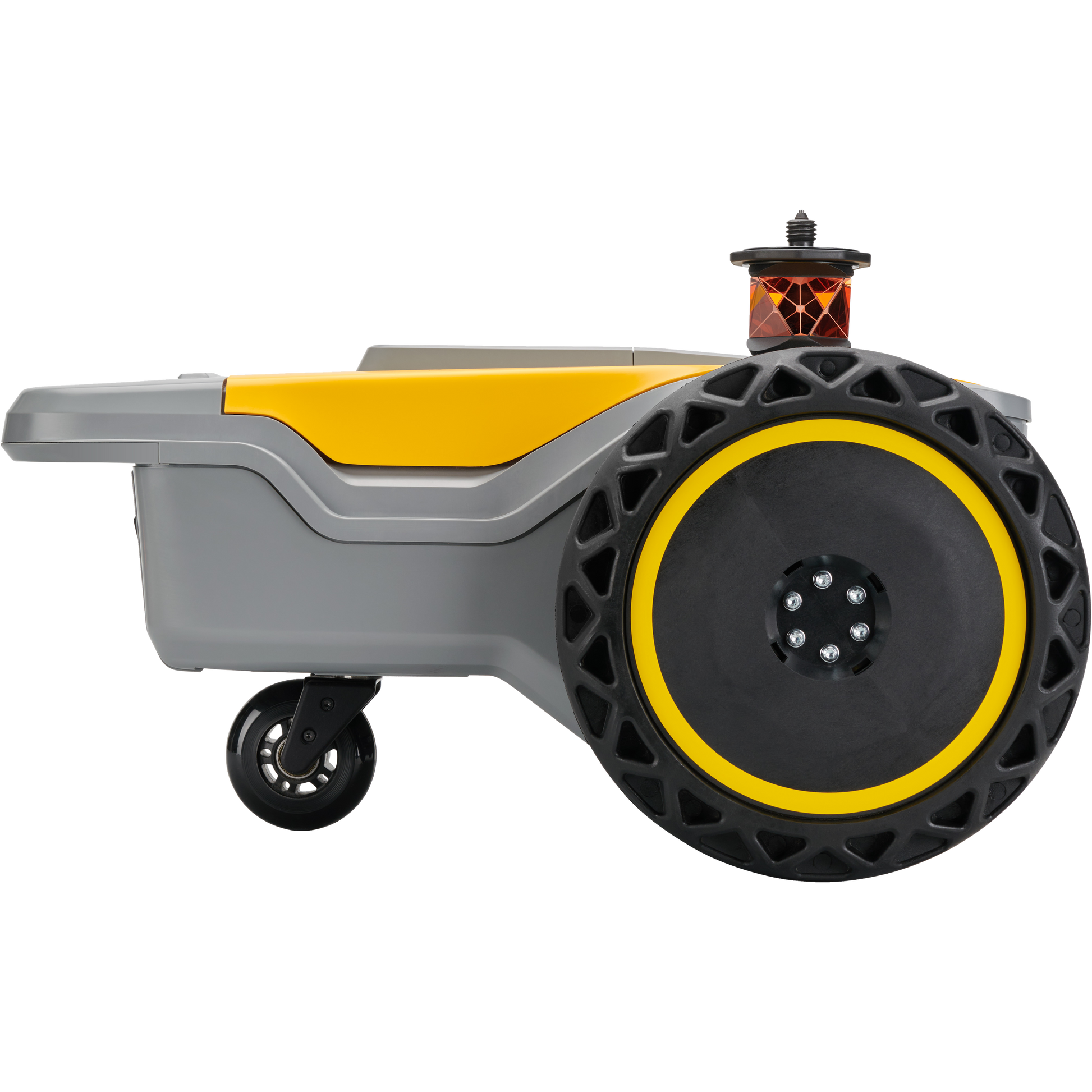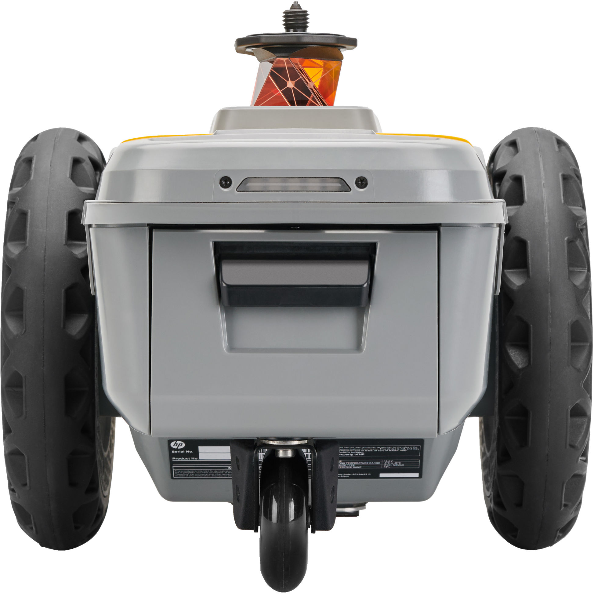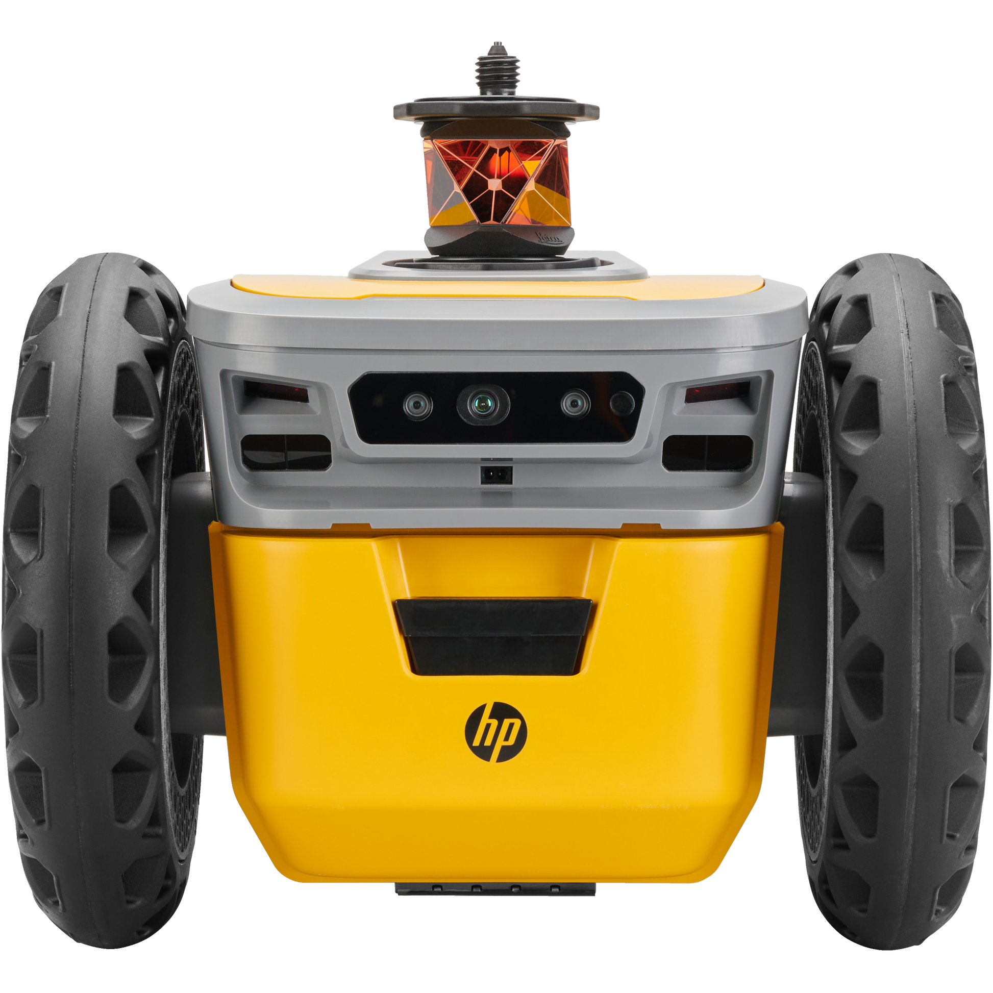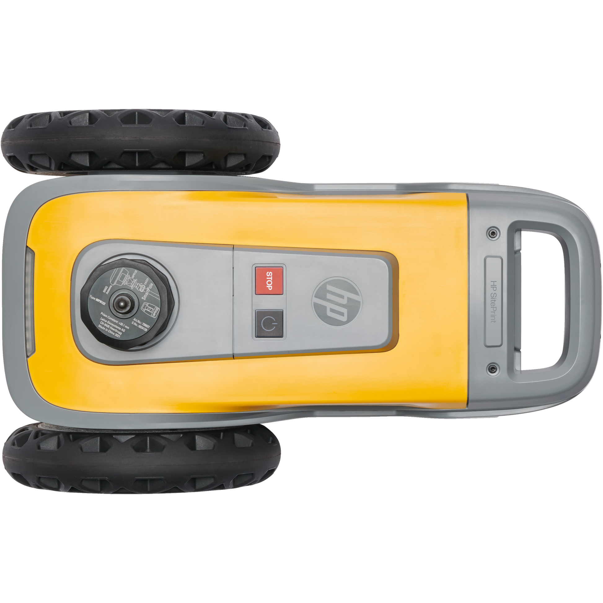 HP SitePrint is a robotic printer with three wheels and a tracking prism integrated. It works together with a Robotic Total Station (surveying tool that measures angles and distances from the instrument to a specific point).